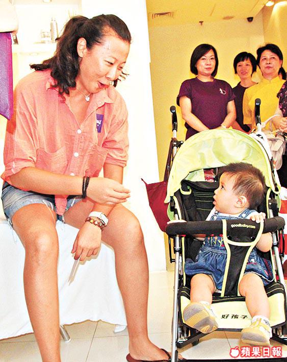 前中國女排隊長馮坤(左),今次來港留了一頭長髮:「退役後想改變一下形象,我已經留了3年。」昨日她出席一項美容店活動時,一直與師姐孫玥的9個月大女兒玩。