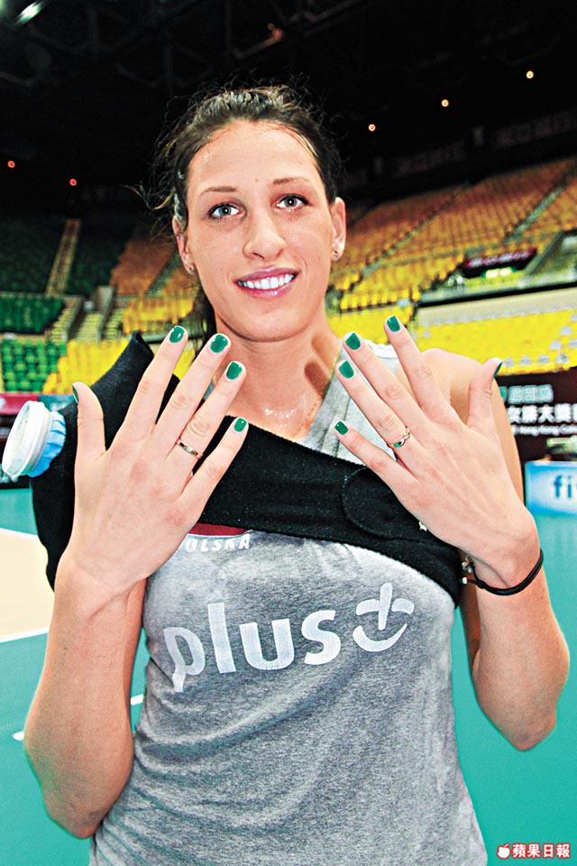 周日將硬撼中國的波蘭女排,兩個月前人事大地震,原教練被炒後,多名主力相繼離開,包括曾為《Playboy》雜誌拍攝全裸寫真的27歲靚女韋比蓮絲卡;全隊處於動盪時期,只有副攻手奧古妮域絲卡一個人甜蜜蜜,右手戴上結婚戒指,和雙手的碧綠色水晶甲份外耀眼。