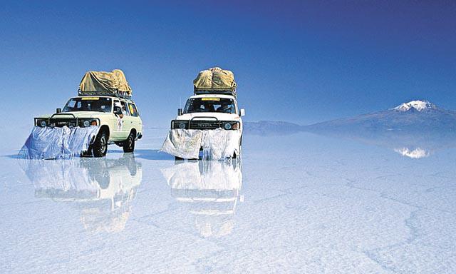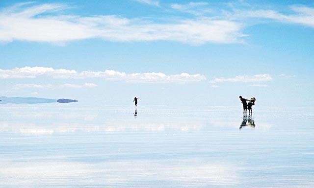 這幅天地連一線、分不清哪裏是天哪裏是地的景象,彷彿是海市蜃樓,但它絕不是海市蜃樓,而是在地上的天堂。南美洲玻利維亞南部烏尤尼鹽沼(Uyunisaltflats),在海拔3,600米高的安第斯山脈之上,面積11,000平方公里,是全球最大的鹽田。每當旱季時,鹽湖會成了鹽原,居民和遊客站在鹽原上,水天相連,天上白雲觸手可及。英國《每日郵報》
