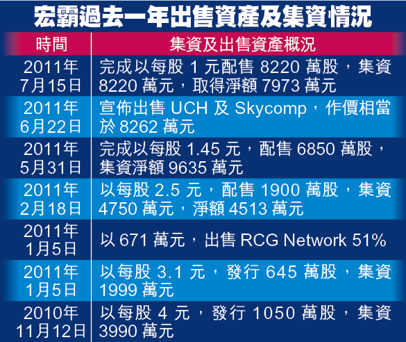 於09年2月上市的宏霸數碼,股價於上市翌日曾高見23元,其後反覆下跌。公司自去年11月起至上月中,五度配股集資逾2.8億元。
