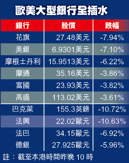 【本報綜合報道】環球市場繼續受歐債危機影響,昨有消息指美國政府擔心歐債禍延美國,紐約聯儲銀行已開始緊盯歐洲銀行短期融資情況,導致歐美一眾銀行股領跌。同時,美國上月份通脹續升溫、8月份製造業指數急跌、新申領失業救濟人數又回升,市場充斥悲觀情緒,憂慮經濟停滯不前,觸發投資者再次拋售股票避險,美國道瓊斯工業平均指數昨開市後一度跌近530點,失守萬一關;10年期國債息亦曾跌破2厘。
