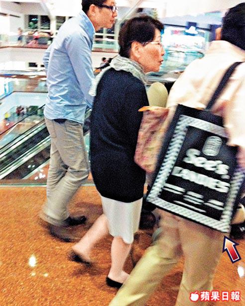 前晚8時,六嬸和六叔各自現身九龍塘又一城商場頂樓,當時坐在輪椅上的六叔戴帽、穿外套,身上搭着一條毛氈,一名中年男子為他推着輪椅慢速閒逛,現場見六叔精神不錯,眼仔睩睩,行經一意粉專門店外時,六嬸與一女伴挽手而至,身旁傭人則孭着一大袋購於See'scandies的戰利品。此品牌來自美國,主打高級朱古力,看來六嬸特登買朱古力冧六叔,好讓老公甜到漏。
