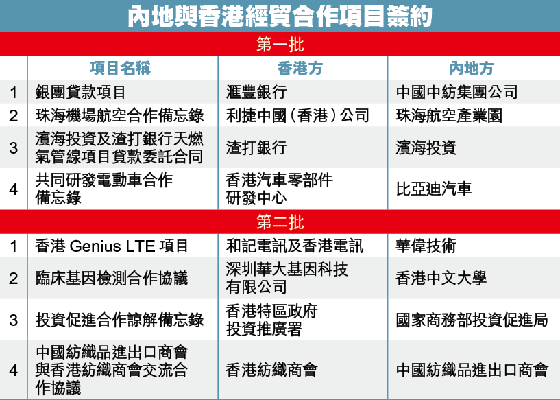 其餘6項中港經貿合作項目,包括滙豐與中紡集團所定的銀團貸款;珠海航空產業園及與港方利捷,訂下珠海機場航空合作備忘錄;渣打與濱海投資共同簽訂的天然氣管線項目貸款。