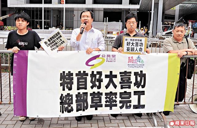 公民黨、關懷香港昨天發起遊行,批評曾蔭權為了邀請李克強為總部揭幕,勒令地盤工人趕工,迎合長官意志,以令工程盡早完成,但卻犧牲工程質素,令大樓工程未盡妥善,日前更令一名警員墮地受重傷。