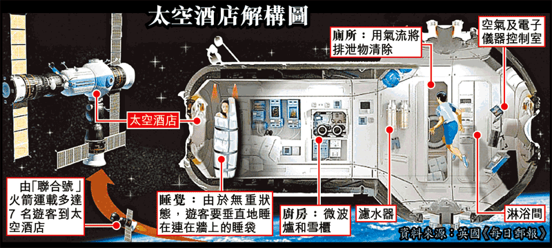 俄羅斯軌道技術公司將於地球上空350公里外建造太空酒店。旅客可攜帶美食上太空用微波爐翻熱來吃。預計2016年啟用,旅費要50萬鎊(640萬港元)。