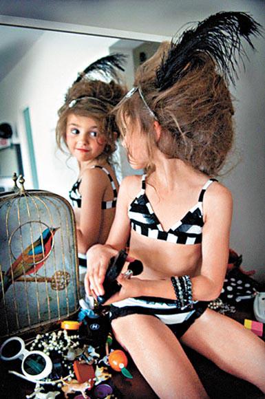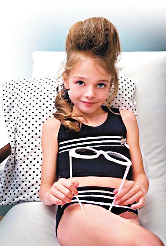 「模」out,「超模」in。在時裝王國法國,時裝界掀起超模熱。繼10歲小超模布隆多性感登上時裝雜誌封面後,法國內衣品牌JoursApresLunes找來多名4至12歲超模,穿上胸圍、內衣、緊身衣和T恤,拍攝性感廣告(圖)。但超模發育未全,童顏配上珍珠頸鏈look,童真稚氣硬裝成熟韻味,業內人士鬧爆。