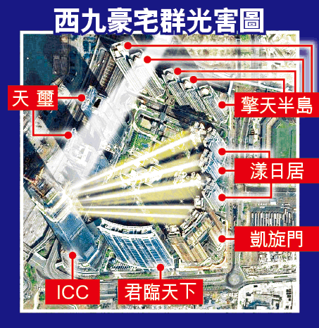 【本報訊】全港最高的環球貿易廣場(ICC)被西九豪宅區業主投訴,被太陽反射到其玻璃幕牆的太陽強光滋擾,飽受人造西斜之苦。惟本港無法例監管日光反射對環境的影響,環保團體直指政府對玻璃反光造成的光害關注不足。