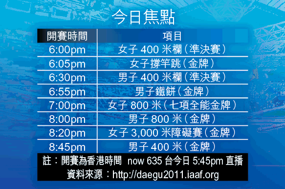 「女鳥人」伊仙芭耶娃為撐竿跳世績保持者(5米06),但她在上屆柏林世錦賽心高氣傲,決賽三次試跳4米75失敗出局,她今年最佳成績亦僅為4米76,與今年最佳成績4米91的美國選手蘇雅仍有一段距離。雙腳裝上刀片狀義肢的「刀片跑手」南非選手比斯托利斯,昨在400米準決賽出局,今日男子400米奪冠焦點,落在美國選手米列特及格林納達的卡拉利占士身上。