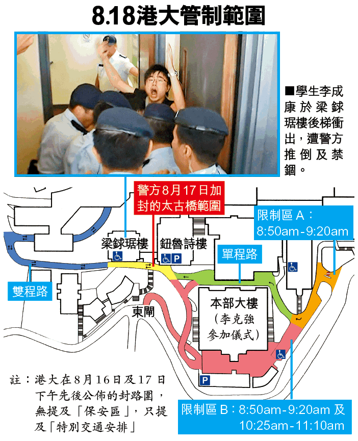 17日下午,本報曾經向港大公關部查詢,對方稱特別交通安排只是針對車輛,行人可以如常使用旁邊的行人路,學校網頁的附圖也只指導車輛如何進出港大。當日一度有傳,港大擬於本部大樓旁的嘉道理生物科學大樓設立示威區,但當晚發言人稱未有定案,似乎出了問題。