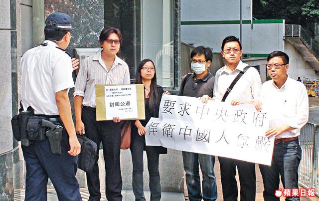 人質事件中殉職領隊謝廷駿的兄弟、倖存者陳國柱及李瀅銓,昨由立法會議員涂謹申陪同,帶同「要求中央政府、衞中國人尊嚴」橫額到公署,獲安排入內與副特派員高玉琛會面約20分鐘。