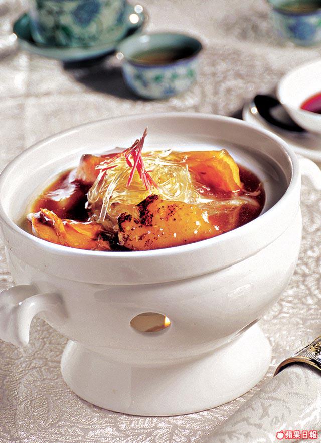 佛跳牆,龍頭地位排在懷舊經典套餐之首,先食為快。「真正佛跳牆是一大煲的,內裏有十多二十種材料,」高師傅說:「除鮑參翅肚,還有熬足十多二十個小時的山瑞掌和鹿筋等等。」他還打趣說,正宗佛跳牆可參考電影《食神》,結賬最少五千元,最貴一圍甚至索價二十萬,以至無限上綱,因為冬蟲草、吉品鮑、上等花膠等材料的結算單位,統統以一後面加四個零計,瓣瓣過萬,果非一般市民吃得起。現在的迷你版佛跳牆呢,有齊魚翅、花膠、海參、瑤柱、鮑魚仔等等材料,盡收入原汁原味的一級火腿老雞頂湯之內,煲足半日,一樣是極品,味道濃郁到沒話可說,別心急灌入肚,謹記咬多兩咬才捲動舌頭送入喉嚨,好讓每顆味蕾也嚐盡真滋味。