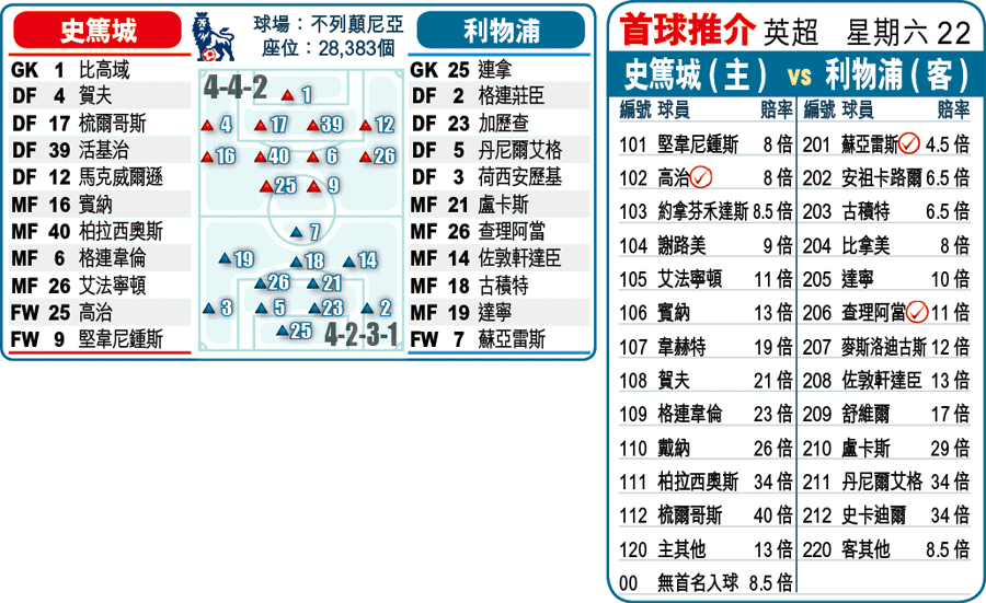 「讓球」利物浦讓平/半,上盤可期。至於「讓球主客和」利物浦[-1],則宜敲「和局」,因為利物浦今役要作客,而且史篤城始終有一定的實力。