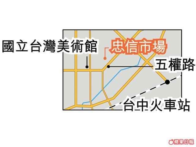就在國立臺灣美術館對面,這裏昔日算是台中的旺角吧!朝早賣水餃、粉仔的早餐檔口全開,午後就執乾執淨,老人默默地在微弱燈光下洗盤子及大鑊,房子通風雖好,但整個區的通風就不好,一家煮飯成村嗅到,阿嬸們更愛將瓦斯爐搬到門外,邊煮邊閒話家常,更遑論開冷氣。能搬的都搬走,剩下一地老人與孩子,訪問時40平米乘三層月租約$2,000超抵!學生都搬了進來,試映會、攝影會、藝術空間、咖啡室在靜靜活躍。據說學生們曾在這裏辦過FashionShow,天橋由街一端的雞檔,經過中間毛筆檔同跌打舖,再延伸至衣紙同水果檔中間,阿婆們圍坐摺椅撥住大葵扇笑住睇,設計師與花在Show-off之際有幾隻雞走過!踏實的生活跟今世代追夢生活融在一起,文化同時代超衝擊!