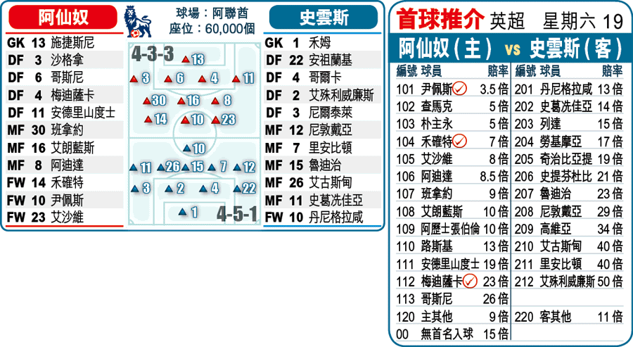 畢竟,升班馬史雲斯人腳與實力均麻麻,今役又缺後衞蒙克及阿倫達迪;而且史雲斯踢法與上屆升班馬黑池相似,識攻唔識守,從之前大敗給曼城一役所見,基本上中門大開,絕對有利阿仙奴的地面戰踢法,故相信阿仙奴今役可以淨勝超過一球打開聯賽勝門,不妨直取兵工廠開「主勝」。文:青蛙仔