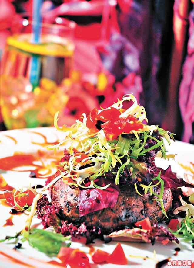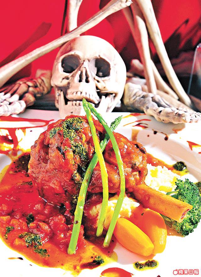 爛Gag講完,即試哈囉喂晚餐(每位$245),頭盤「開腦冥奴」,用切碎的巴西鹹牛脷混牛油果製成沙律,內含紫蘇、香草、松子、橄欖油打成的蛋黃醬,全新口感非常醒胃。餐湯「魔眼血池」非常血淋淋,其實是番茄忌廉湯,矜貴在番茄用慢煮法熬足兩小時,上鋪日本松葉蟹柳和黑水欖,每啖「血漿」都極鮮味。