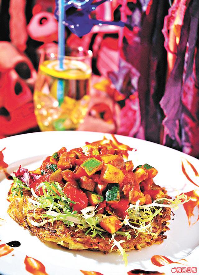 哈囉喂大餐,既可茹毛飲血也可如素,齋口不齋心,做鬼也風流,改良版哈囉喂素食套餐(每位$245),一樣有甜品「鬼面幽靈」和特飲「攝青鬼」,頭盤則有「漆黑的墓穴」,即烤大蘑菇沙律,Juicy到無得頂,味道很清新。主菜有「血肉碎靈枱」,即瑞士薯餅配意式燴雜菜,薯餅很脆口,但略嫌賣相不夠血腥,必須豪飲「魅影閻皇血」才可止咳,這餐湯實情是黑松露豌豆茸湯,很濃稠,很飽肚。