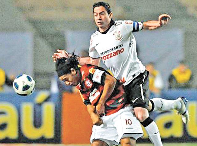 周四巴甲,哥連泰斯主場以2:1反勝法林明高;圖為法林明高中場朗拿甸奴(左),在對手力壓下失去控球權。互聯網
