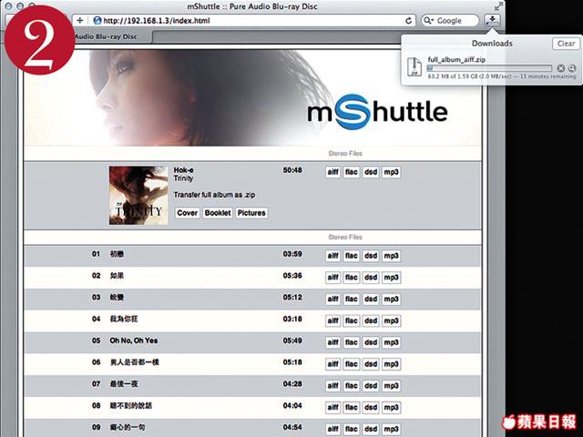 不過,藍光碟的版權保護,會造成轉檔的不便,而純音藍光加入的mShuttle技術,可讓電腦簡單地從接駁具網絡功能嘅藍光碟機,下載音樂檔案。例如《Trinity》就提供有AIFF、FLAC、DSD及MP3等格式,檔案會保留有歌曲資料,可直接在電腦或放到手機上播放,另外還將唱片封面、Booklet及相片等輸出成PDF,讓你可「全套」收藏,可以話係將唱片完全檔案化。
