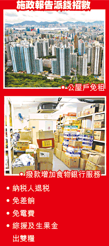【本報訊】曾蔭權下月發表任內最後一份施政報告,將再開庫房派錢,包括向納稅人退稅、綜援家庭及長者生果金出雙糧、公屋免租、免差餉等,但不會再派6,000元現金。同時,針對高通脹,為減輕低收入人士生活壓力,當局會增加食物銀行撥款。政府消息稱,曾蔭權亦決定了復建居屋,但計劃具體名稱及執行細節,仍在最後階段研究中。