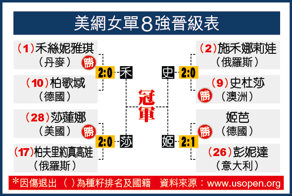 此外,女單4強全部產生,去年法網亞軍史杜莎直落兩盤6:3淘汰施禾娜莉娃,將鬥德國「巨人殺手」姬芭;姬芭周四再炮製冷門賽果,以2:1險勝26號種籽彭妮達。這位23歲德國小花賽前寂寂無聞,但左手握拍的她抽擊強而有力,實力不容低估,現距離美網錦標只差兩步;姬芭興奮地說:「昨晚我從夢中驚醒,然後問自己,這是發夢還是真實。」綜合美國外電