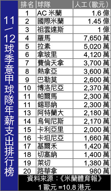 在新一季意甲年薪排行榜,AC米蘭以1.6億歐元(約17.3億港元)排首位,並比次席的國際米蘭高出1,500萬歐元。至於最少的則是升班馬路華拿,人工總支出是980萬歐元,連AC前鋒伊巴的一半也沒有。而在今季意甲,總共有5支球隊包括卡坦尼亞、基爾禾、切塞納、萊切及路華拿,全年人工支出是低於伊巴。