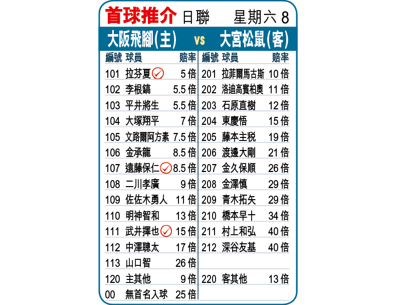 日聯「1哥」大阪飛腳狀態好之餘人腳亦整齊,周六主場鬥大宮松鼠,贏波冇難度,直取[-1]「主勝」。(球賽編號:星期六8;now633及660台今日6:00pm直播)
