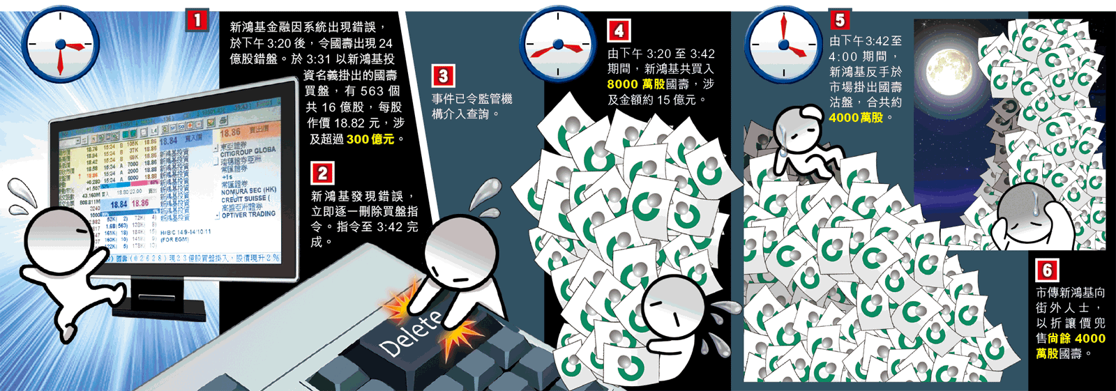 據了解,昨懷疑有新證人士「按錯掣」,透過公司內的電腦系統發出龐大的國壽買盤指令,發現後企圖即時取消指令,但因系統出現故障未能取消,「眼白白」等了10分鐘才恢復運作,結果「成就」了昨日的「壯舉」。有經紀指,昨日原本一班在沽國壽的對冲基金發現有龐大買盤,一度提高叫價,不久發現無盤「跟進」,反手沽得更狠。