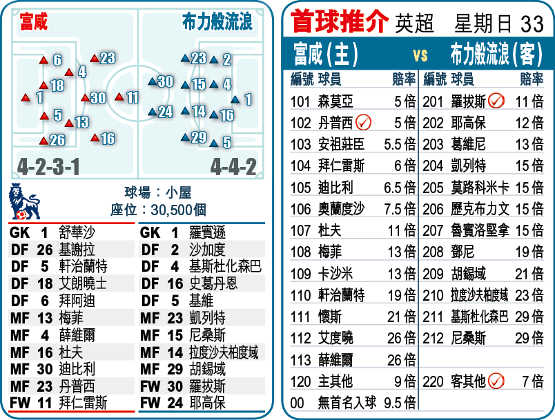 兩軍是役為「1」而戰,富咸為本季英超首場勝利而戰,布力般則力爭本季第1分。無疑,布力般開季對狼隊、維拉及愛華頓3連敗,而目前陣殘,賴恩尼爾遜、摩頓柏達臣及鄧尼等較為球迷所熟識的戰將,齊因傷避戰,確是令人擔心。