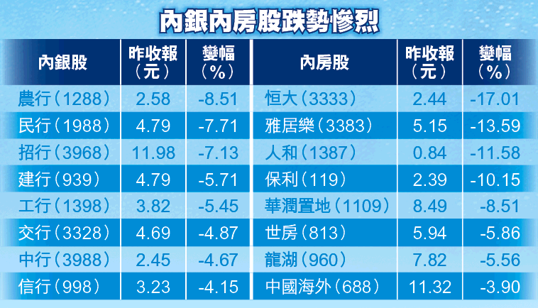 內銀存款餘額急跌,幅度隨時比四大行上半月存款流失4200億人民幣更誇張,民間借貸有機會弄至資金鏈斷裂,內銀股首當其衝,建行(939),工行(1398),中行(3988)急挫4至5%,農行(1288)下瀉8.5%,民行(1988)及招行(3968)均跌7%。
