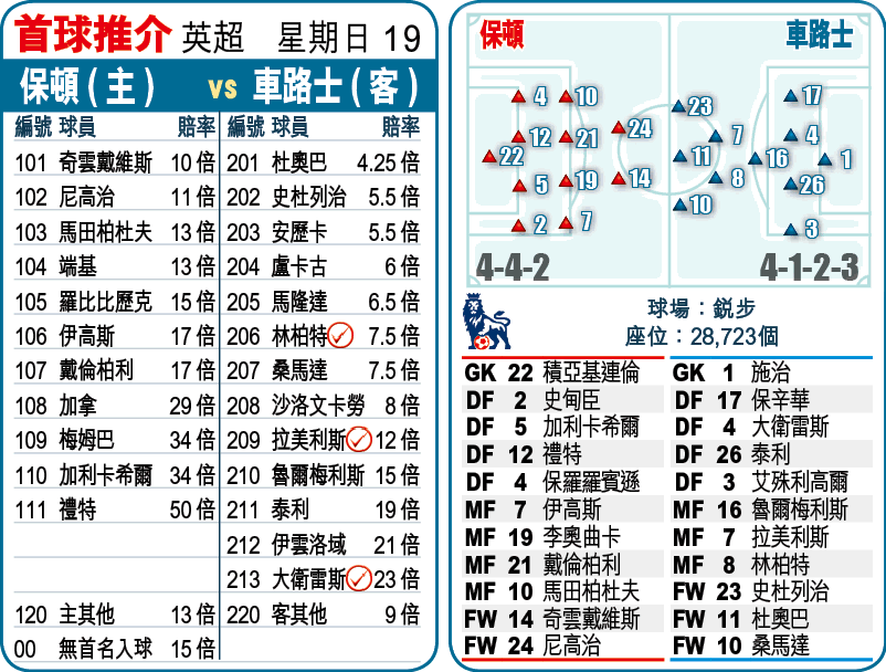 以車路士現時的狀態及人腳,周日於英超作客包尾兼陣容不整的保頓,料可輕鬆贏波而回,必捧[-1]「客勝」。(球賽編號:星期日19;有線200及300台今日8:30pm直播)