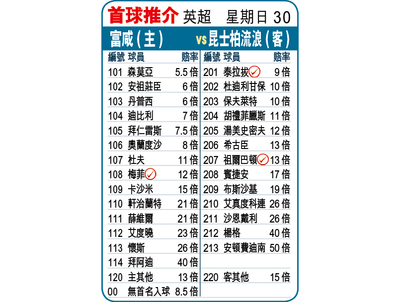 同日富咸主場對昆士柏流浪(球賽編號:星期日30;有線204及304台今日10:00pm直播),主隊近9場僅贏一場,狀態差,有祖爾巴頓等主力壓陣的昆士柏流浪有力不敗,取[+1]「客勝」。另外,史篤城近14場只輸一場,又有比高域及活基治等復任正選,陣容完整,作客升班馬史雲斯有力開W,平手值吼(球賽編號:星期日31;有線201及301台今日10:00pm直播)。文:青蛙仔