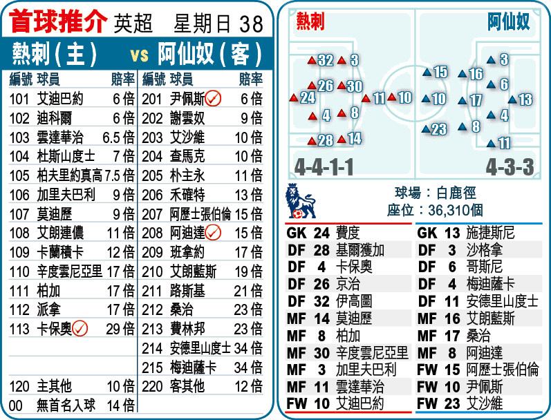 熱刺及阿仙奴上周中歐洲賽不約而同留力,只為周日這場英超北倫敦打吡戰而來;以近況論,兩軍同處上升軌道,實在難分高下,熱刺讓平/半博下盤外,主客和亦取「D」。(球賽編號:星期日38;有線200及300台直播)牽牛