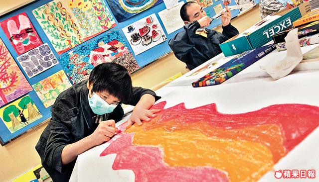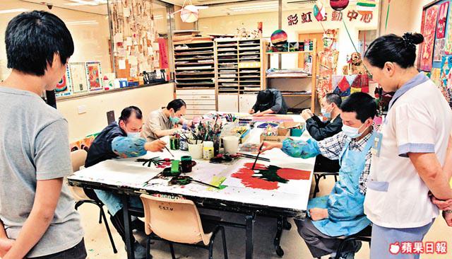 訪問當日,剛好有幾名智障病人正在中心內埋頭創作,有人用廣告彩描繪房內的一盆假花,有人用箱頭筆為畫紙上的漢堡包填色,也有人本身用水彩畫好了一個個圓圈,但看見鄰座那位畫得漂亮,結果將圓圈全變成漢堡包,畫完還不斷問在場的義工:「畫得靚唔靚?」
