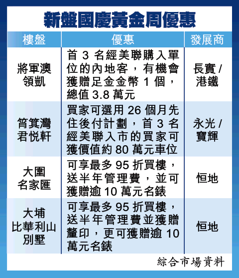 今年受市況逆轉影響,內地客到港買樓熱潮退減,今年國慶黃金周設優惠樓盤寥寥無幾,貨尾盤筲箕灣君悅軒設先住後付計劃。內地睇樓團暫時只有兩至三團參觀新盤,與五.一假期相比可謂差天共地。美聯將會招待1團約30人來自深圳及廣州的內地客來港,參觀將軍澳領凱。置業18則會有20至30組溫州及福建客於未來一星期來港睇樓。