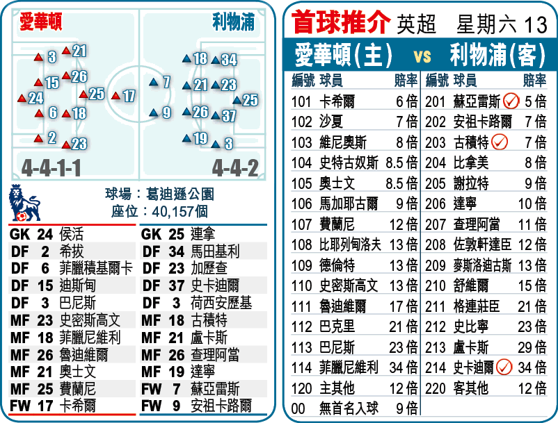 大換血後的利物浦今季表現尚算對辦,加上有謝拉特傷癒候命,周六於英超作客「拖肥糖」愛華頓進行默西賽德打吡,有力把連捷場數增至3場,少讓平/半值捧。