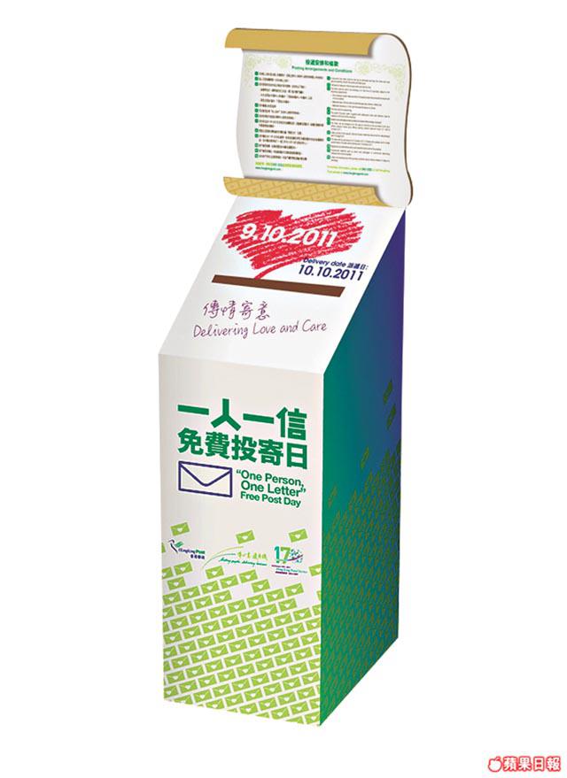 投遞時間:10月7日至9日於全線郵政局設「免費郵遞日」特別收集箱收集郵件。