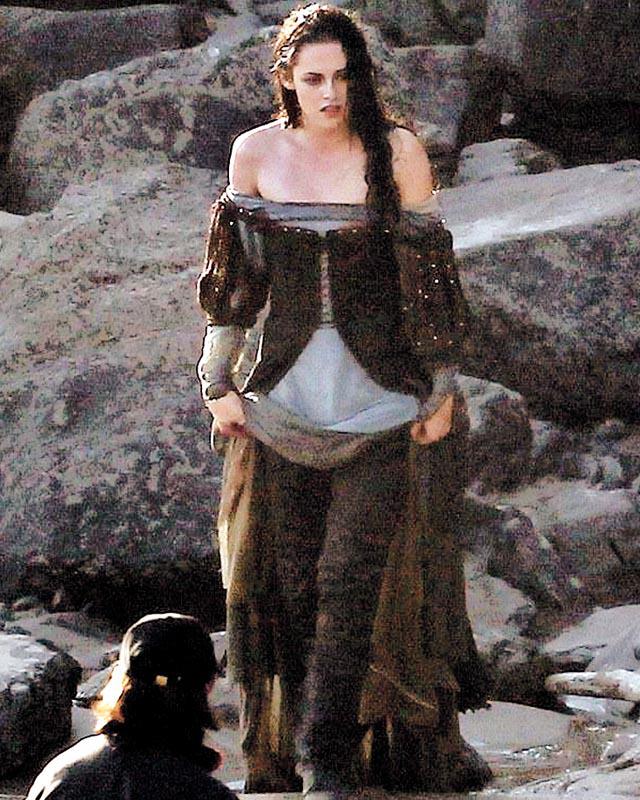前日姬絲頓繼續在該威爾斯海灘開工,她終於回復公主應有的嫵媚,穿上薄紗長裙亮相,不過依然腳踏啡色馬靴。因為該場戲集中講述姬絲頓要安慰她的白馬,所以片中守護她扮獵人的《雷神奇俠》(Thor)男星基斯咸士禾夫(ChrisHemsworth)、邪惡皇后查理絲泰朗(CharlizeTheron)等統統無影。