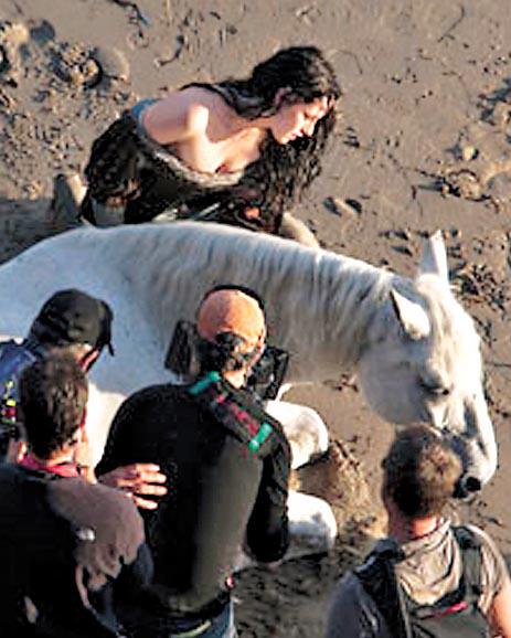 美國女星姬絲頓史釗域(KristenStewart)日前被影到一反白雪公主形象,為新片《SnowWhiteandTheHuntsman》開工時穿盔甲騎馬打仗又扯煙,前日她繼續反傳統,一向骨感身材的她竟然濕身谷胸與白馬做對手戲,畫面養眼!