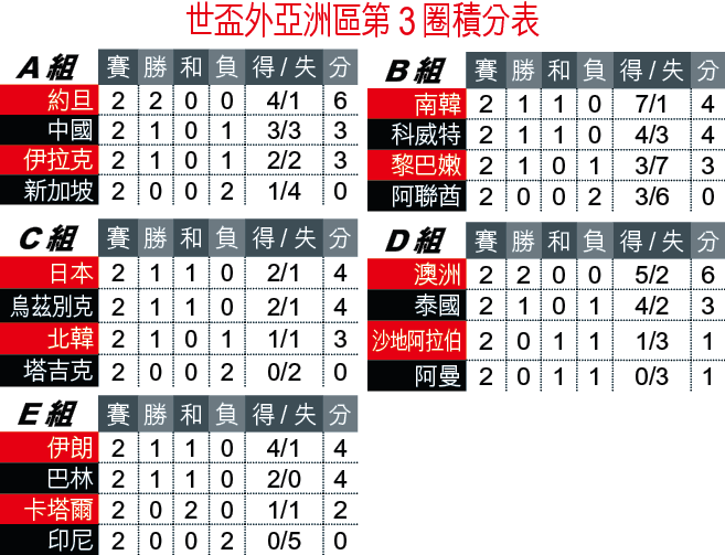 南韓的對手亦不易應付,同組有科威特、黎巴嫩及阿聯酋。南韓前鋒朴主永說:「如稍有差池,隨時緣盡決賽周,故我們必須打醒十二分精神。」以日本、南韓及澳洲的級數,只要臨場沒有失準,應可取得入場券;至於中國能否繼02年日韓世盃後再入決賽周,便要看教練甘馬曹的造化了。文:青蛙仔