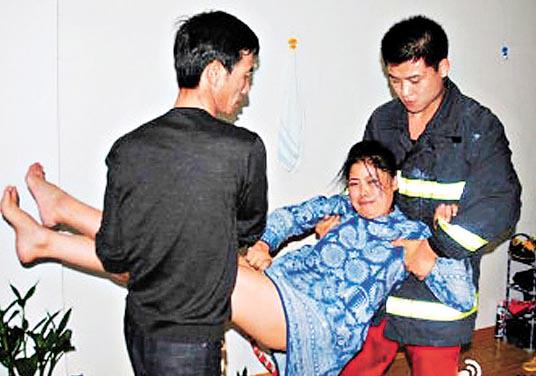 她穿着藍色連身裙,疑未穿內褲,頻頻露底走光。消防員接報到場後打開氣墊,並勸說她約20分鐘,最後成功將她強行拉回屋內。據悉當日為她的生日,她喝醉酒後想起自己的手提電腦及現金被偷,損失無法挽回,壓力過大而欲自殺。上海東方網
