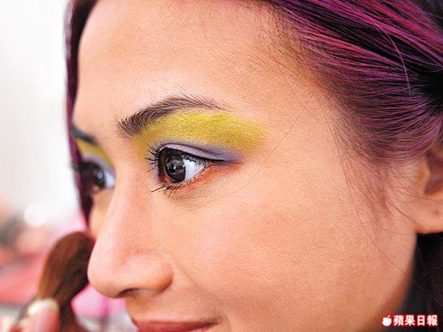 可選對比強烈的色彩,如深紫撞黃、黑撞銀等,方法是將眼窩分兩部份,眼線對上塗一種色,眼線位又塗另一種,下眼線亦可以再配其他色。