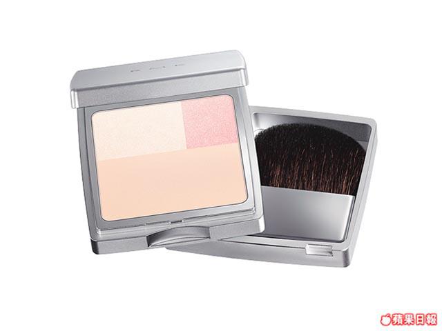 粉餅中的米黃及桃色能輕易地使膚色均勻透亮;加上淡淡粉紅及粉紫元素,可讓面部輪廓更立體。
