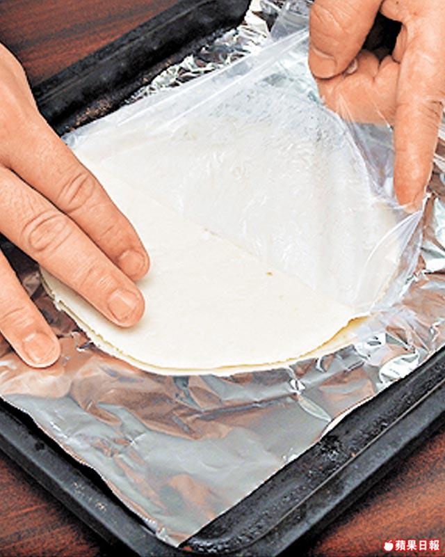 2.千層酥放在鋪上錫紙的焗盤上,放入預熱至200℃焗爐,焗4分鐘。