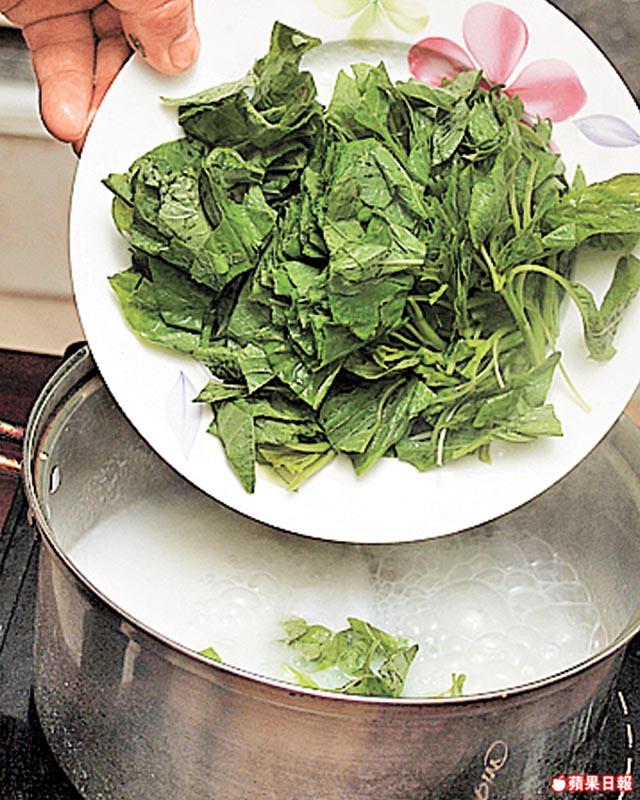 3.放入莧菜,繼續以小火煮20分鐘,下鹽調味即可。
