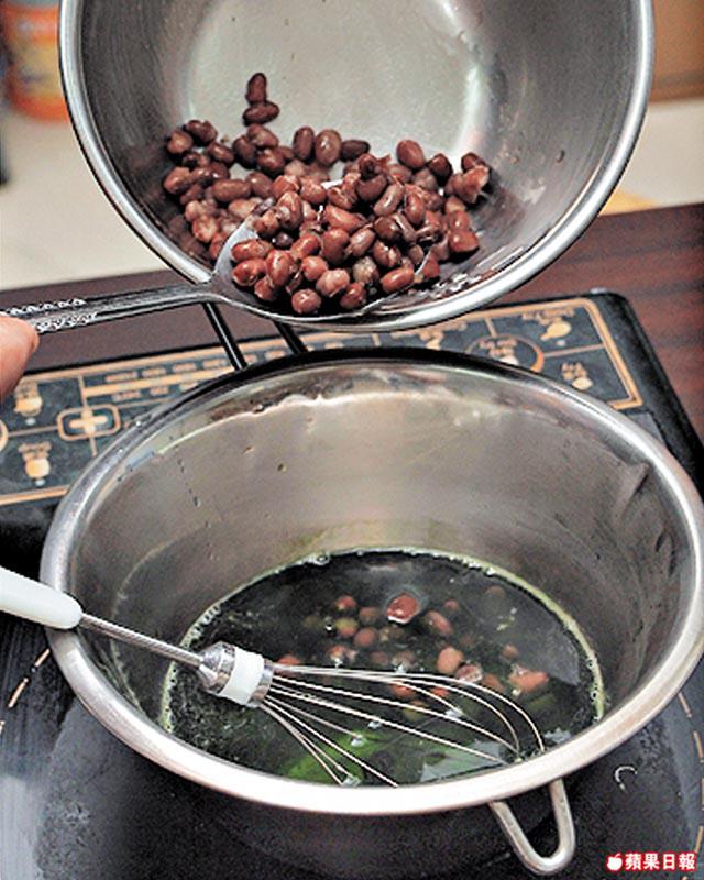 紅豆(已熟)30克、糖20克、魚膠粉8克、綠茶粉2茶匙、凍開水400毫升