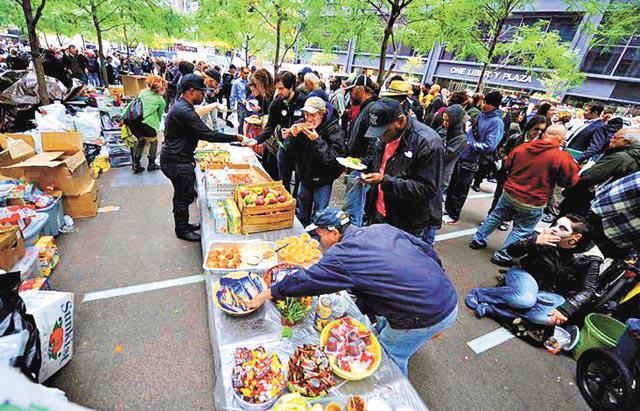「佔領」行動開始時,祖科蒂公園只有200人,後來一度有超過2,000人,但這些人都未必全然投入這場抗爭。示威者中有無家可歸的流浪漢,他們當然抗爭有理,只是更多是覷準公園定時定候免費派發的食物,或希望找到毒品。