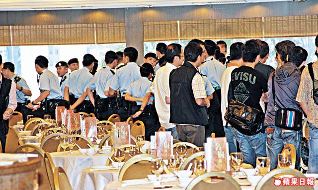 警方接獲線報,馬上由西九龍總區反黑組、重案組,聯同九龍城的刑事部探員、軍裝警員逾50人,掩至有關酒家,更有便衣探員攜同兩頭警犬到場協助控制場面。警員進入酒樓後立即喝止眾大漢。