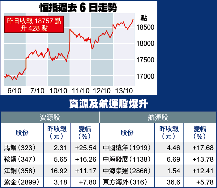 大笨象滙控昨升逾3%,中資保險股國壽(2628)及平保(2318)分別升逾5%及7%,是昨日升市最大功臣。涉造假疑雲的思捷環球(330)走勢持續波動,前日大插7%後,昨反彈15%,是表現最佳藍籌,內房股在中央放水及解除限購令憧憬下越升越有,華潤置地(1109)及中國海外(688)分別升逾11%及7%。資源股及航運股表現省鏡,中國遠洋(1919)、中海發展(1138)、中海集運(2866)升幅介乎12至17%;馬鋼(323)及鞍鋼(347)分別升25%及16%。