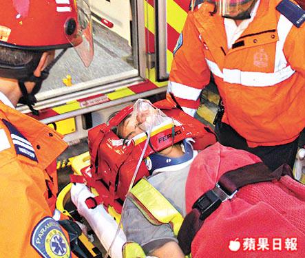 【本報訊】銅鑼灣希慎廣場地盤昨午發生工業意外,一名技工在泵房進行天花消防水泵工程時,失足從3米高長梯跌落地,盆骨撞傷動彈不得,要消防救護員抬上擔架床救落地面,再送院治療。