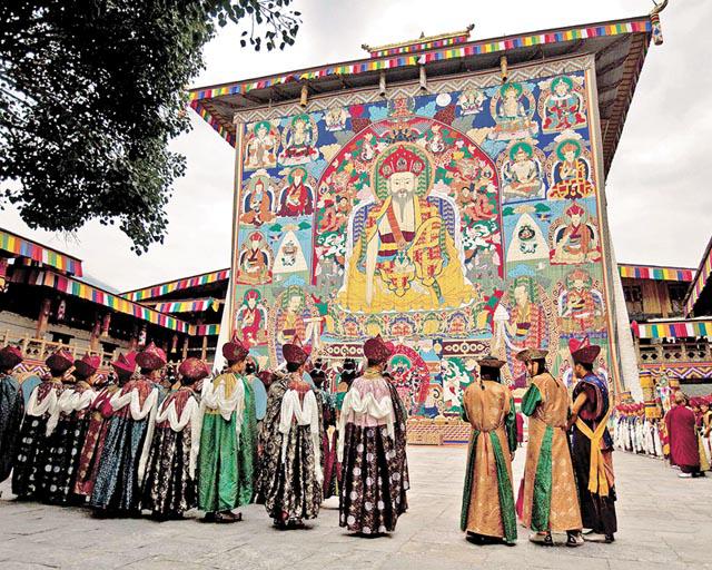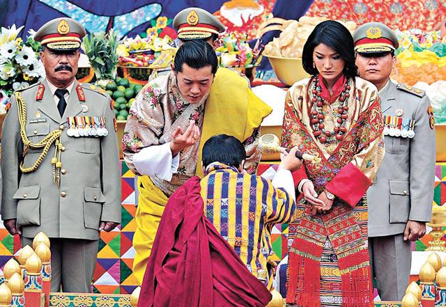 年輕英俊、溫文爾雅的凱薩爾向來親民,大婚之日也與眾同樂。昨晨8時20分,他採取不丹國家藏傳佛教的大婚儀式開始了。他外披黃色肩布金袍、腳穿五彩靴子,在喇嘛引領下,步入舊都普那卡(Punakha)兩河交滙之間的17世紀聖廟殿堂。幾分鐘後,身穿紅色、金色和黑色禮服的新娘子佩瑪,隨着喇嘛進場。這時,民眾載歌載舞、打鼓慶賀,喇嘛則在一幅30米高、畫了建立不丹的17世紀法王夏尊那旺南嘉肖像的唐卡之前,為一對新人誦經。